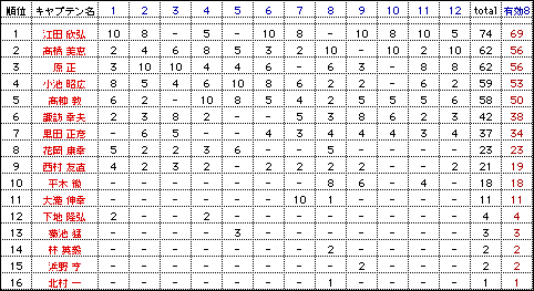 シリーズ1位は、4回の優勝と3回の2位で安定度抜群の江田・柿内組。 シリーズ2位は、夏以後の後半に3回の優勝を固めた高橋・正田組。 シリーズ3位は、前半に連続優勝した、原・植木・井野組。 |