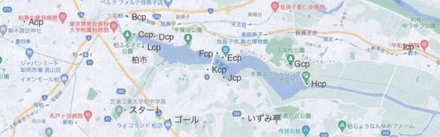 ACP:農産物直売所かしわや、BCP:北柏駅南口、CCP:北柏ふるさと公園、DCP:根戸新田水神社、 ECP:あびこ農産物直売所、FCP:手賀沼親水広場、GCP:五本松公園、HCP:手賀沼フィッシングセンター、 ICP:気象台公園、JCP:手賀沼、KCP:道の駅しょうなん、LCP:北千葉導水ビジターセンター |