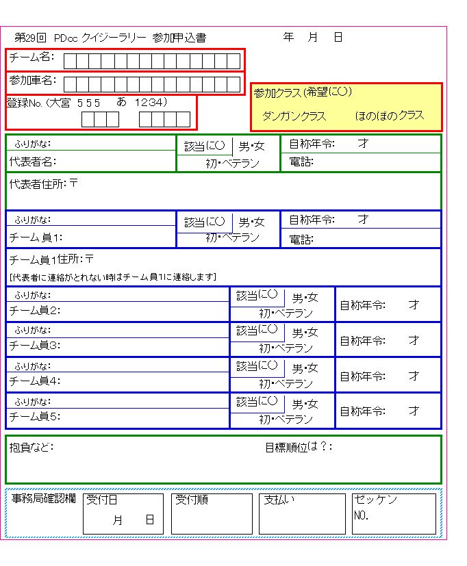 申込書は原則として郵送でお願いします。宛先:〒 355-0214 埼玉県比企郡嵐山町志賀274-150 尾針得介 宛。 お急ぎの時には、ファックスでも申し込みできます。ファックスの宛先を知りたい方は「クイジーラリー申込FAX先問い合わせ」という題名で気軽にこちらにメールを送ってください。できるだけ早く返事します。