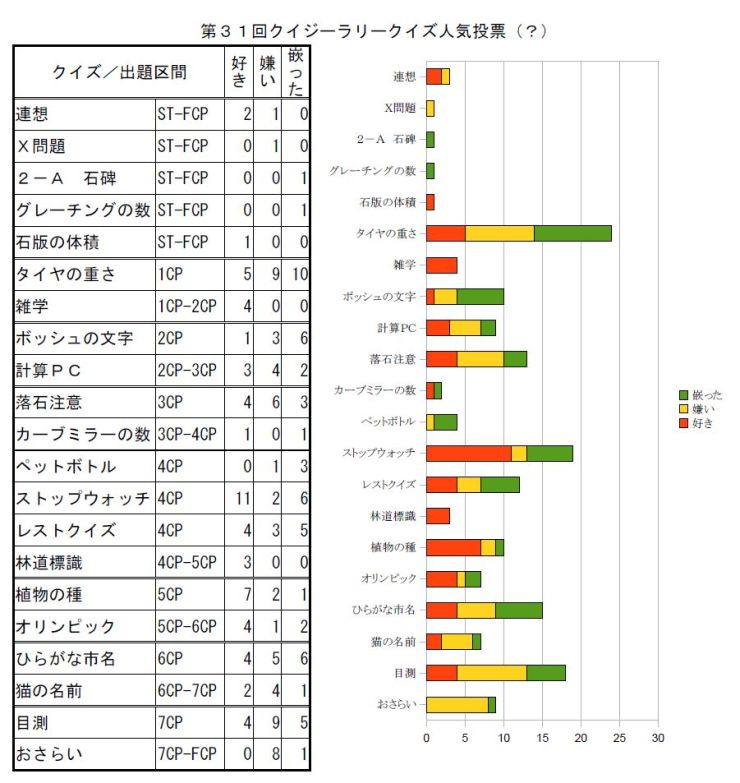 嫌いなクイズは1CPのその場クイズ”タイヤの重さ”、7CPの”目測”などでした。 思いの外難易度が高かった、と言うことでしょうか。。。(^^;;;